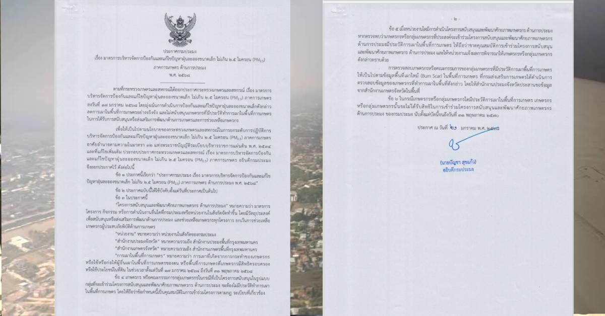 ล่าสุดกรมประมงออกประกาศกรมประมง เรื่อง มาตรการบริหารจัดการป้องกันและแก้ไขปัญหาฝุ่นละอองขนาดเล็ก ไม่เกิน 2.5 ไมครอน (PM 2.5) ภาคการเกษตร ด้านการประมง พ.ศ.2568 โดยมีวัตถุประสงค์ไม่ให้การสนับสนุนเกษตรกรหรือกลุ่มเกษตรกรที่มีประวัติทำการเผาในพื้นที่การเกษตร ในการได้รับการสนับสนุนและพัฒนาศักยภาพเกษตรกรด้านการประมง รวมทั้งโครงการต่างๆ ทุกโครงการ หากตรวจพบว่า เกษตรกรหรือคณะกรรมการกลุ่มเกษตรกรที่ประสงค์จะเข้าร่วมโครงการใดๆ ทางด้านการประมง แต่มีประวัติการเผาในพื้นที่การเกษตรให้ถือว่า “ขาดคุณสมบัติ” และจะไม่ได้รับสิทธิในการเข้าร่วมโครงการฯ ด้านการประมงทุกโครงการ นับตั้งแต่บัดนี้ไปจนถึงวันที่ 31 พฤษภาคม 2570