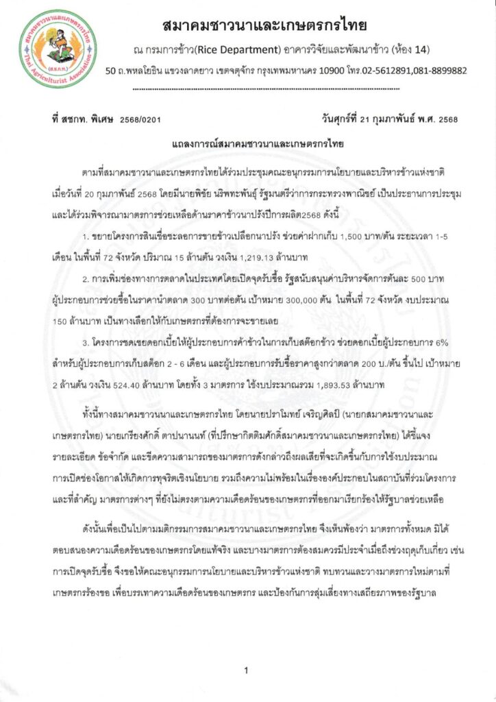 นายปราโมทย์ เจริญศิลป์ นายกสมาคมชาวนาและเกษตรกรไทย กล่าวว่า สมาคมชาวนาและเกษตรกรไทยออกแถลงการณ์ล่าสุด หลังจากเข้าร่วมประชุมคณะอนุกรรมการนโยบายและบริหารข้าวแห่งชาติเมื่อวันที่ 20 กุมภาพันธ์ 2568 โดยมีนายพิชัย นริพทะพันธุ์ รัฐมนตรีว่าการกระทรวงพาณิชย์ เป็นประธาน โดยที่ประชุมมีมติกำหนดมาตรการช่วยเหลือด้านราคาข้าวนาปรังปีการผลิต 2568 ดังนี้