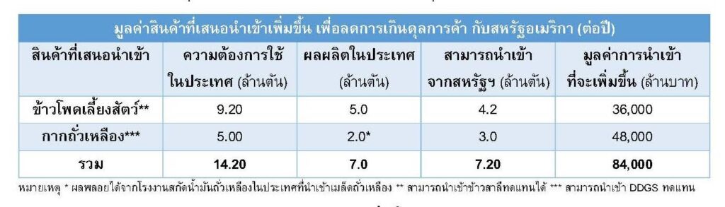 สมาคมผู้เลี้ยงสุกรแห่งชาติจึงเสนอให้รัฐบาลนำเข้าสินค้าวัตถุดิบอาหารสัตว์จากสหรัฐอเมริกาได้แก่ ข้าวโพดเลี้ยงสัตว์ ข้าวสาลี กากถั่วเหลือง และ DDGS (Distillers Dried Grains) ซึ่งล้วนเป็นสินค้าที่ไทยมีความต้องการใช้สูง แต่ไม่สามารถผลิตได้เพียงพอในประเทศ โดยเสนอให้แปรเปลี่ยนถิ่นกำเนิดสินค้านำเข้ามายังไทยให้เป็นของสหรัฐอเมริกา เพื่อสร้างมูลค่าการนำเข้าสินค้าจากสหรัฐอเมริกาได้มากถึง 2,500 ล้านดอลลาร์ หรือประมาณ 84,000 ล้านบาทต่อปี