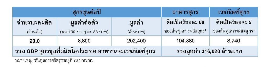 สำหรับสุกรเป็นหนึ่งในอาหารโปรตีนหลักของคนไทยและเป็นอุตสาหกรรมที่สร้างห่วงโซ่เศรษฐกิจสำคัญให้กับประเทศ โดยไทยผลิตสุกรกว่า 23 ล้านตัวต่อปี สร้างมูลค่าสุกรมีชีวิตถึง 202,400 ล้านบาท ในขณะที่ห่วงโซ่อุตสาหกรรมสุกรทั้งระบบได้แก่ อาหารสุกร และเวชภัณฑ์สุกร สร้างมูลค่าเพิ่มอีกกว่า 113,000 ล้านบาท ทำให้มูลค่ารวมของ GDP อุตสาหกรรมสุกรไทยมากถึง 316,020 ล้านบาทต่อปี