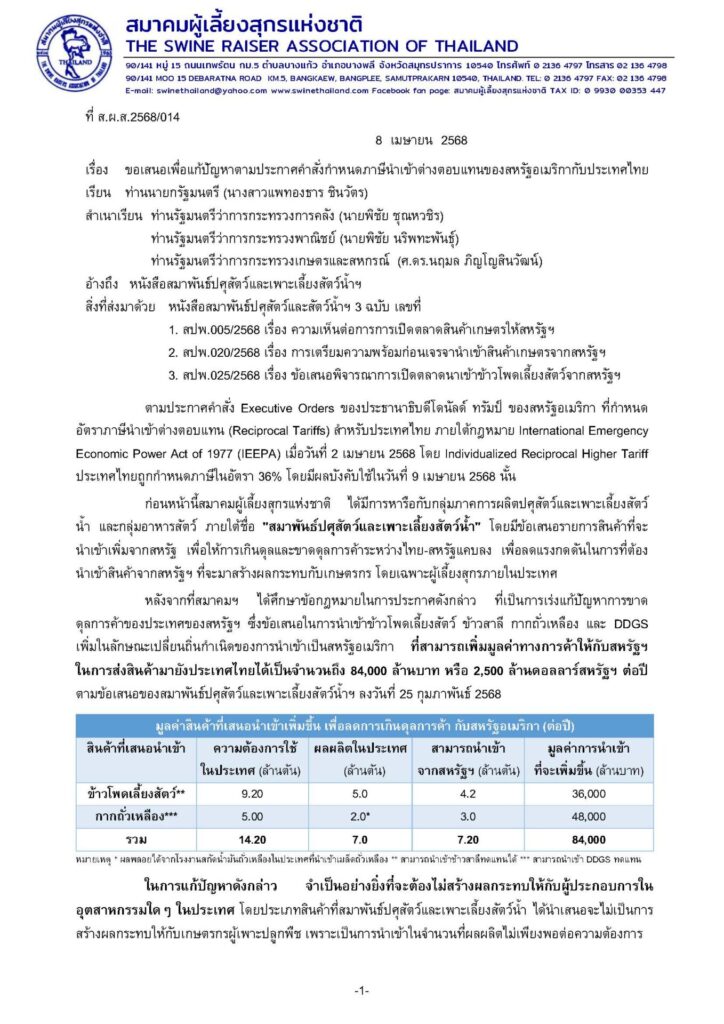 ทำเนียบฯ 8 เม.ย. – สมาคมผู้เลี้ยงสุกรแห่งชาติ พร้อมตัวแทนผู้เลี้ยงสุกรยื่นข้อเสนอถึงนายกรัฐมนตรีและรัฐมนตรีคลัง-พาณิชย์-เกษตรฯ แก้ปัญหาการกดดันทางการค้าจากสหรัฐฯ โดยให้หันมานำเข้าข้าวโพดและกากถั่วเหลืองจากสหรัฐฯ เพื่อนำมาเป็นวัตถุดิบอาหารสัตว์ ระบุการนำเข้าทดแทนส่วนขาดในประเทศจะลดการเกินดุลอย่างมีนัยสำคัญ หวังสหรัฐฯ ผ่อนคลายภาษีนำเข้าต่างตอบแทนกลับมาในอัตราระดับเดิม