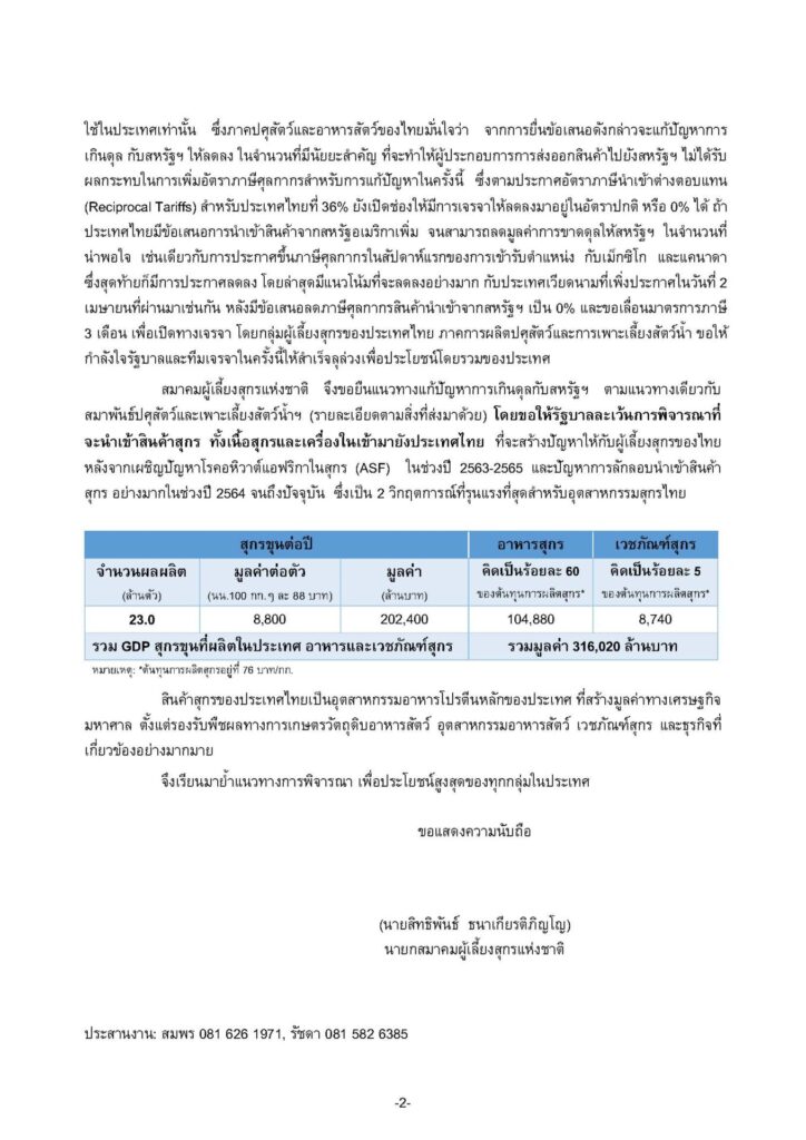 ทั้งนี้ สมาคมผู้เลี้ยงสุกรแห่งชาติร่วมกับสมาพันธ์ปศุสัตว์และเพาะเลี้ยงสัตว์น้ำฯ ประเมินว่า การปรับเปลี่ยนดังกล่าว จะสามารถเพิ่มมูลค่าทางการค้าให้กับสหรัฐฯ ในการส่งสินค้ามายังประเทศไทยได้เป็นจำนวนถึง 84,000 ล้านบาท หรือ 2,500 ล้านดอลลาร์สหรัฐฯ ต่อปี