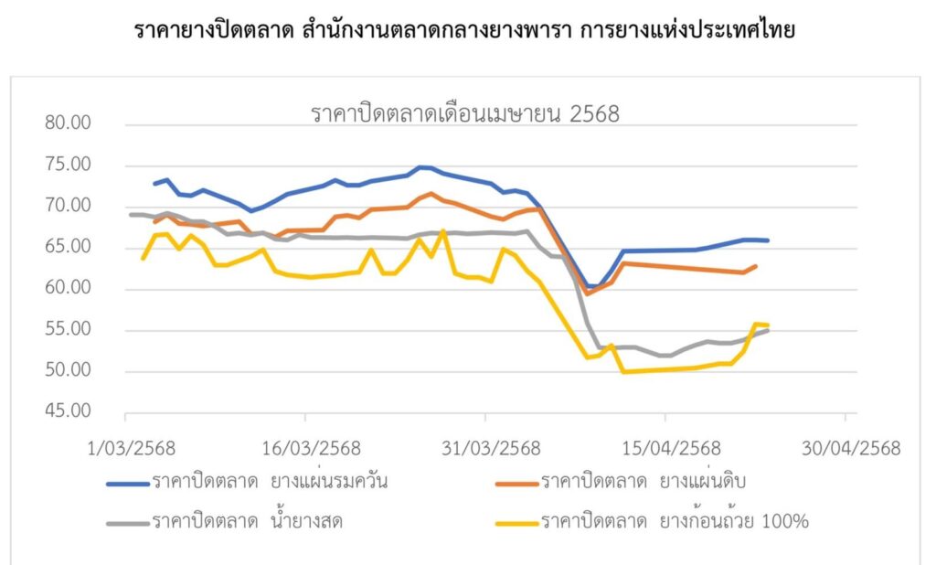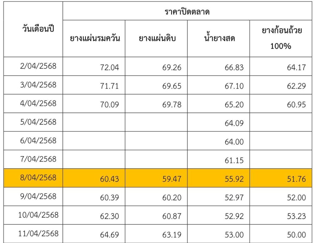 ศ.ดร.นฤมล ภิญโญสินวัฒน์ รัฐมนตรีว่าการกระทรวงเกษตรและสหกรณ์ แจ้งข่าวดีต่อพี่น้องเกษตรกรชาวสวนยาง ราคายางพาราทุกชนิดปรับตัวสูงขึ้น 3 – 10.3 บาทต่อกิโลกรัม หลังจากก่อนหน้านี้เมื่อเปิดตลาดวันที่ 8 เมษายน ราคายางทุกชนิดปรับลดลงหนักถึง 10 – 12 บาทต่อกิโลกรัมในวันเดียว สาเหตุจากมาตรการภาษีนำเข้าสหรัฐฯ ที่ประกาศโดยประธานาธิบดี Donald Trump เมื่อวันที่ 2 เมษายนที่ผ่านมา