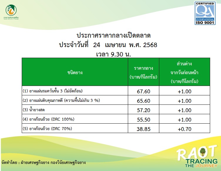 24 เม.ย.- ราคายางพาราขยับขึ้น “รมว. เกษตรฯ” เดินหน้าควบคุมยาง-ปกป้องเกษตรกรจากผลกระทบจากมาตรการภาษีต่างตอบโต้ของสหรัฐอเมริกา