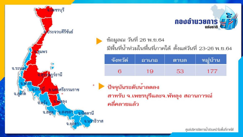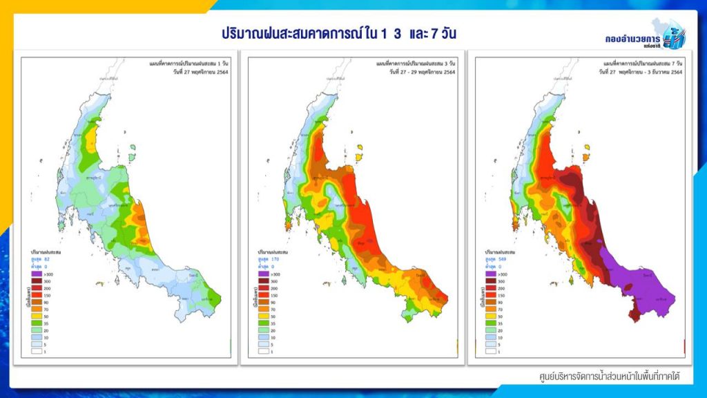 นายชยันต์ เมืองสง รองเลขาธิการสำนักงานทรัพยากรน้ำแห่งชาติ (สทนช.) ในฐานะเลขานุการกองอำนวยการน้ำแห่งชาติ (กอนช.) เปิดเผยว่า ศูนย์บริหารจัดการน้ำส่วนหน้าในพื้นที่ภาคใต้ กอนช. ตรวจวัดปริมาณฝนตกสะสมในพื้นที่ภาคใต้พบว่า มีแนวโน้มเพิ่มขึ้น โดยปริมาณฝนตกสะสมสูงสุด ณ วันที่ 26 พ.ย.64 (เวลา 07.00 น.) อ.ท่าชนะ จ.สุราษฎร์ธานี 179 มิลลิเมตร อ.ดอนสัก จ.สุราษฎร์ธานี 173 มิลลิเมตร อ.นบพิตำ จ.นครศรีธรรมราช 173 มิลลิเมตร อ.สิชล จ.นครศรีธรรมราช 153 มิลลิเมตร อ.หลังสวน จ.ชุมพร 135 มิลลิเมตร