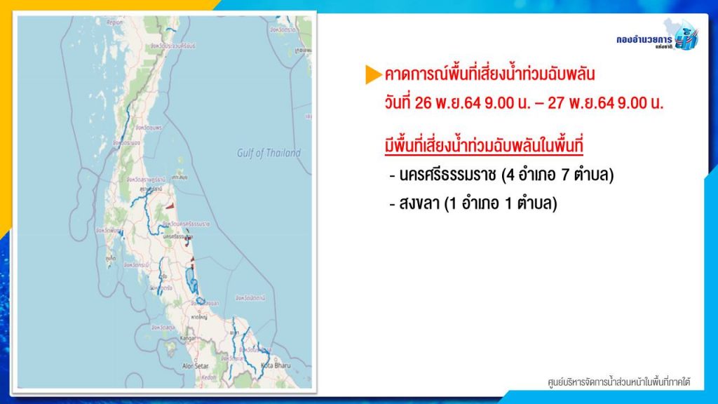 นายชยันต์กล่าวต่อว่า ขณะนี้มีพื้นที่ประสบภัยน้ำท่วมฉับพลัน น้ำป่าไหลหลาก และน้ำล้นตลิ่ง 4 จังหวัดได้แก่ ประจวบคีรีขันธ์ ชุมพร สุราษฎร์ธานี และนครศรีธรรมราช ล่าสุดร่วมกับ กรมอุตุนิยมวิทยาและสถาบันสารสนเทศทรัพยากรน้ำ (องค์การมหาชน) คาดการณ์ว่าในวันที่ 28 พ.ย. – 1 ธ.ค. 64 อิทธิพลของมรสุมตะวันออกเฉียงเหนือและหย่อมความกดอากาศต่ำ จะส่งผลให้ภาคใต้มีฝนเพิ่มขึ้น รวมทั้งมีฝนตกหนักถึงหนักมาก มีพื้นที่เสี่ยงน้ำหลากที่ต้องเฝ้าระวังอย่างใกล้ชิด ประกอบด้วย