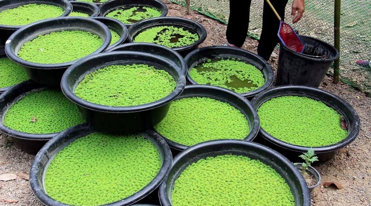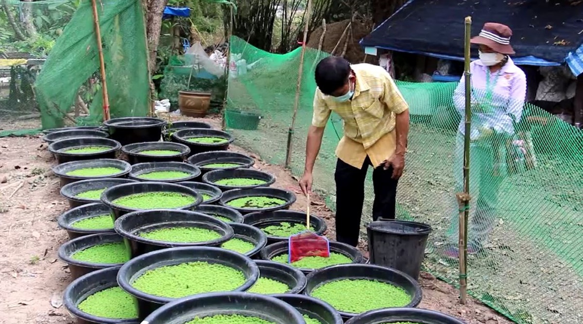 ไปดูการเลี้ยงไก่ไข่อารมณ์ดี ที่สวนโชคสมบูรณ์ ของนายโชคดี ตั้งจิตร์ เลขที่ 55/1 หมู่ 8 ต.นางแก้ว อ.โพธาราม จ.ราชบุรี ซึ่งก่อนหน้านี้ นายโชคดี เคยรับราชการในตำแหน่งหัวหน้ากลุ่มส่งเสริมและพัฒนาเกษตรกร จ.ราชบุรี และอดีตเกษตรอำเภอวัดเพลง หลังเกษียณอายุได้หันมาปลูกพืชผัก ผลไม้ เลี้ยงสัตว์ผสมผสาน บนเนื้อที่ประมาณ 10 ไร่ ร่วมกับนางสุขสมบูรณ์ ภรรยา และลูกชาย 2 คน ซึ่งเป็นเกษตรกรเครือข่ายขยายผลจากศูนย์ศึกษาวิธีการฟื้นฟูที่ดินเสื่อมโทรมเขาชะงุ้ม อันเนื่องมาจากพระราชดำริ นำความรู้มาปรับปรุงปลูกพืชผักผสมผสาน ในสายงานอาชีพมาปรับใช้ทำการเกษตร โดยนำแหนแดงไมโครฟิลล่า (ชื่อแหนแดง แต่สีเขียว) จากศูนย์วิจัยและพัฒนาการเกษตรราชบุรี และสำนักงานเกษตรจังหวัดฯ มาเลี้ยงใส่กะละมังกลางแดด เพื่อขยายพันธุ์นำไปเลี้ยงไก่ไข่ โดยแหนแดงไมโครฟิลล่า มีประโยชน์ต่อการเลี้ยง ช่วยให้ไก่ออกไข่สม่ำเสมอ ให้โปรตีนสูง