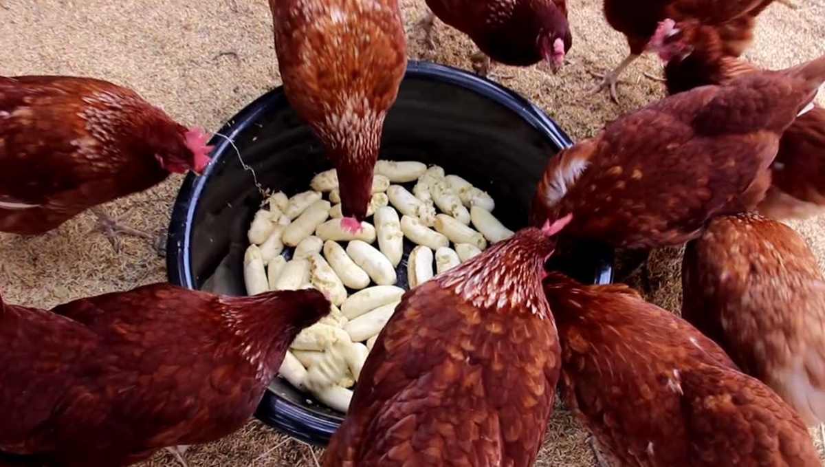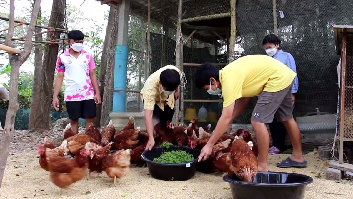 ทุกวันจะตักแหนแดงจากกะละมัง และกล้วยน้ำว้าสุกงอมที่ปลูกไว้ในสวน นำมาปอกเปลือกใส่กะละมังให้ไก่กินเป็นอาหารเสริม จากการใช้หยวกกล้วยผสมกับข้าวโพด รำ ปลายข้าว ปลาป่น คลุกเคล้าตามสูตร นำมาให้ไก่กิน โดยไม่ใช้อาหารเม็ดแบบกระสอบในการเลี้ยง ทำให้ช่วยลดต้นทุน