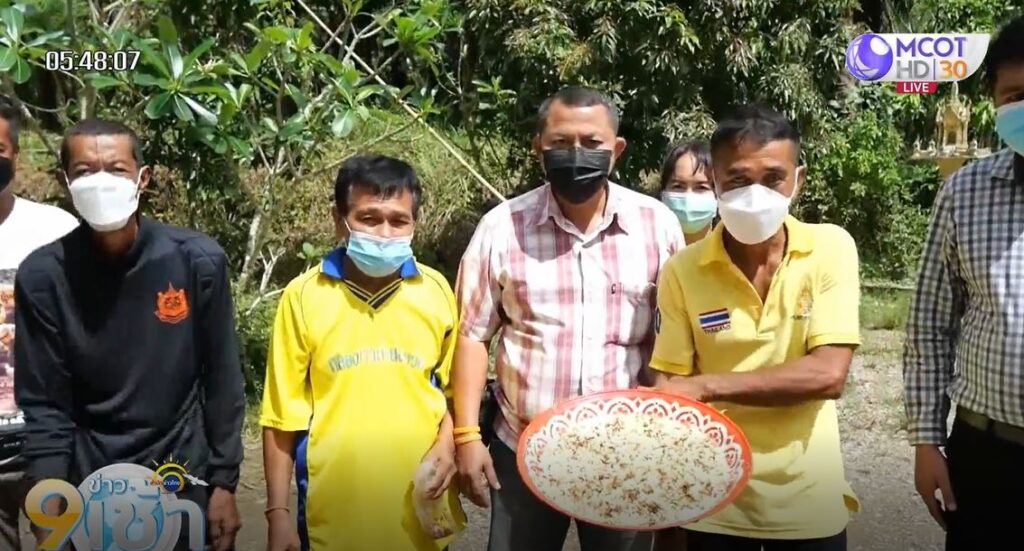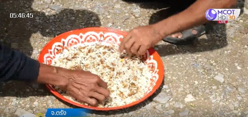 นายอาคม ครชาตรี ผู้ใหญ่บ้านหมู่ 7 ต.อ่าวตง อ.วังวิเศษ จ.ตรัง กำลังช่วยกันแยงไข่มดแดงตามต้นมะม่วงที่ปลูกไว้รอบบ้าน และตามต้นไม้อื่นๆ หลังมีชาวบ้านเดินทางมาขอซื้อ