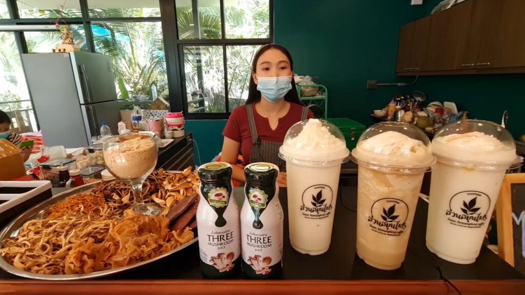เห็ดมีหลากหลายชนิด มีสรรพคุณแตกต่างกันไป ดังนั้นในปัจจุบันจึงมีผู้นิยมนำเห็ดมาแปรรูป เป็นผลิตภัณฑ์ต่างๆ มากมาย เช่นเดียวกับ นางสาวบุญทริกา ลิ้มไพบูลย์ หรือ น้องแนน วัย 26 ปี เจ้าของร้านติดเกาะร่องสวนคาเฟ่ ตำบลดอนมะโนรา อำเภอบางคนที จังหวัดสมุทรสงคราม ได้คิดค้นสูตรกาแฟผสมเห็ด 8 ชนิด ประกอบด้วย เห็ดเป๋าฮื้อ, เห็ดหอม, เห็ดภูฏาน, เห็ดหูหนูขาว, เห็ดยามาบูชิตาเกะ, เห็ดหูหนู, เห็ดถั่งเช่า และเห็ดหลินจือ ผสมผสานในชื่อ มัชรูมคอฟฟี่, มัชรูมคอฟฟี่ผสมมะพร้าวปั่น, มัชรูมมะพร้าวปั่น, มัชรูมเลม่อน, มัชรูมเลม่อนโซดา เป็นต้น ได้รสชาดละมุน หอมอร่อย อีกทั้งยังดีต่อสุขภาพ ถูกใจลูกค้าที่เดินทางมาลิ้มลอง