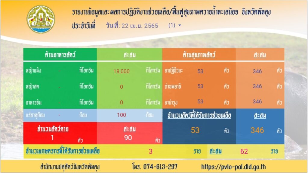 กรุงเทพฯ 22 เม.ย.- อธิบดีกรมปศุสัตว์ สั่งการให้ปศุสัตว์จังหวัดพัทลุง เดินหน้าฟื้นฟูสุขภาพควายน้ำทะเลน้อยที่มีภาวะโลหิตจาง เนื่องจากขาดสารอาหาร โดยเข้าฉีดวัคซีน ยาถ่ายพยาธิ และยาบำรุง ซึ่งเป็นการช่วยเหลือระยะเร่งด่วน โดยวางแผนส่งเสริมการเลี้ยงในระยะยาวไว้แล้ว
