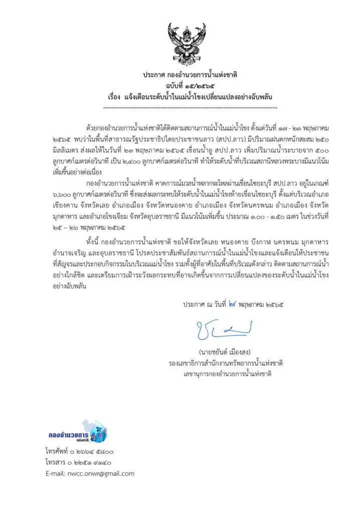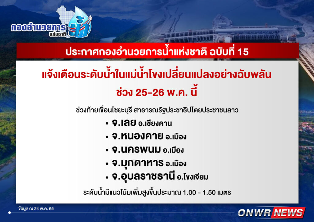 นายประพิศ จันทร์มา อธิบดีกรมชลประทาน เปิดเผยว่า ตามประกาศของกองอำนวยการน้ำแห่งชาติ ฉบับที่ 15/2565 เรื่อง “แจ้งเตือนระดับน้ำในแม่น้ำโขงเปลี่ยนแปลงอย่างฉับพลัน” เนื่องจากในพื้นที่สาธารณรัฐประชาธิปไตยประชาชนลาว(สปป.ลาว) มีฝนตกหนัก วัดปริมาณฝนสะสมได้มากถึง 250 มิลลิเมตร ส่งผลให้เมื่อวันที่ 23 พ.ค. 65 เขื่อนน้ำอู สปป.ลาว มีปริมาณน้ำเพิ่มสูงขึ้น และได้เพิ่มการระบายน้ำจาก 500 ลูกบาศก์เมตรต่อวินาที เป็น 2,400 ลูกบาศก์เมตรต่อวินาที ทำให้ระดับน้ำที่บริเวณสถานีหลวงพระบาง มีแนวโน้มเพิ่มขึ้นอย่างต่อเนื่อง กองอำนวยการน้ำแห่งชาติ ได้คาดการณ์มวลน้ำหลากจะไหลผ่านเขื่อนไซยะบุรี สปป.ลาว ในเกณฑ์ประมาณ 6,600 ลูกบาศก์เมตรต่อวินาที ซึ่งจะส่งผลกระทบให้ระดับน้ำในแม่น้ำโขงด้านท้ายเขื่อนไซยะบุรี ตั้งแต่บริเวณอำเภอเชียงคาน จังหวัดเลย อำเภอเมือง จังหวัดหนองคาย อำเภอเมือง จังหวัดนครพนม อำเภอเมือง จังหวัดมุกดาหาร และอำเภอโขงเจียม จังหวัดอุบลราชธานี มีแนวโน้มเพิ่มขึ้น ประมาณ 1.00 – 1.50 เมตร ในช่วงวันที่ 25 – 26 พฤษภาคม 2565