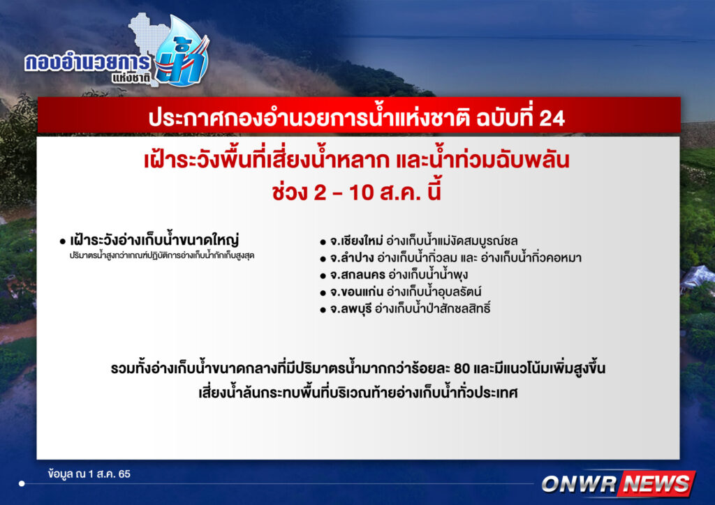 ส่วนอ่างเก็บน้ำขนาดใหญ่ที่ต้องเฝ้าระวังเนื่องจากมีปริมาตรน้ำสูงกว่าเกณฑ์ปฏิบัติการอ่างเก็บน้ำกักเก็บสูงสุด (Upper Rule Curve) 6 แห่งได้แก่ อ่างเก็บน้ำแม่งัดสมบูรณ์ชล จังหวัดเชียงใหม่ อ่างเก็บน้ำกิ่วลม และกิ่วคอหมา จังหวัดลำปาง อ่างเก็บน้ำน้ำพุง จังหวัดสกลนคร อ่างเก็บน้ำอุบลรัตน์ จังหวัดขอนแก่น และอ่างเก็บน้ำป่าสักชลสิทธิ์ จังหวัดลพบุรี รวมทั้งติดตามสถานการณ์น้ำในอ่างเก็บน้ำขนาดกลางทั่วประเทศที่มีปริมาตรน้ำมากกว่าร้อยละ 80 และมีแนวโน้มเพิ่มสูงขึ้นซึ่งเสี่ยงน้ำล้นกระทบพื้นที่บริเวณท้ายอ่างเก็บน้ำ
