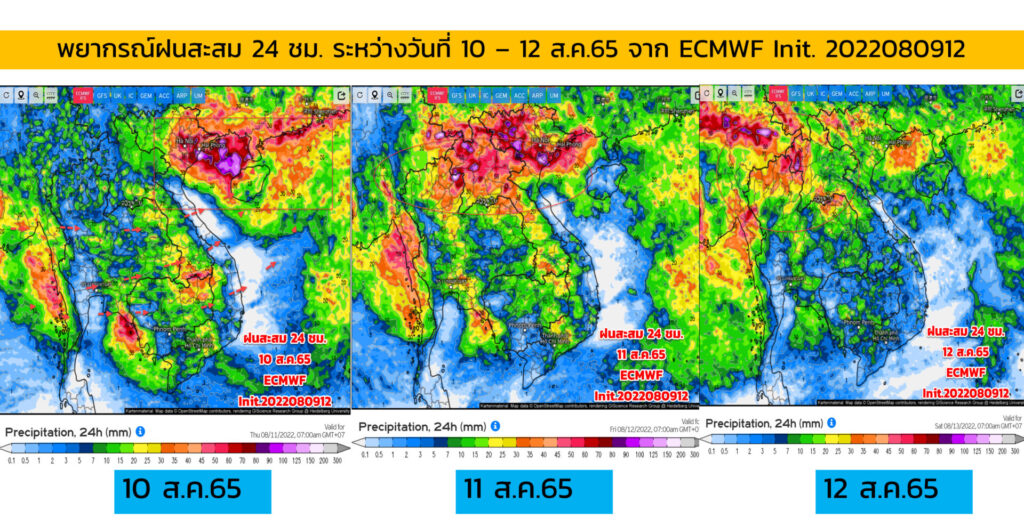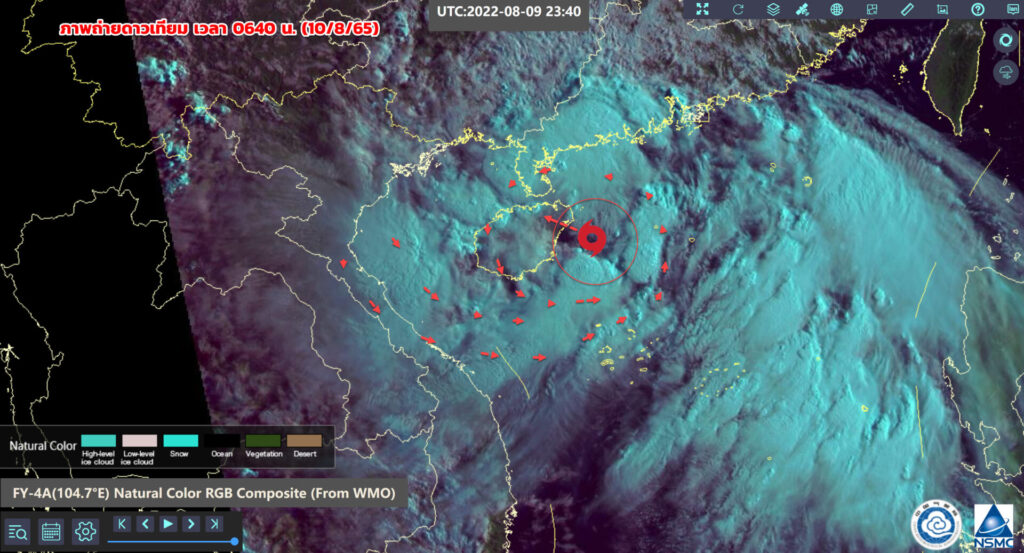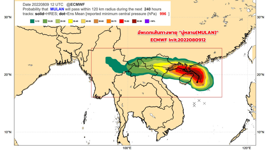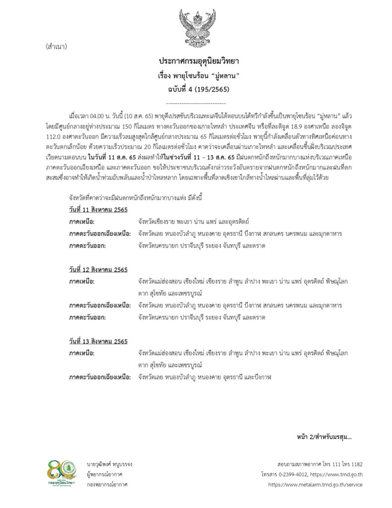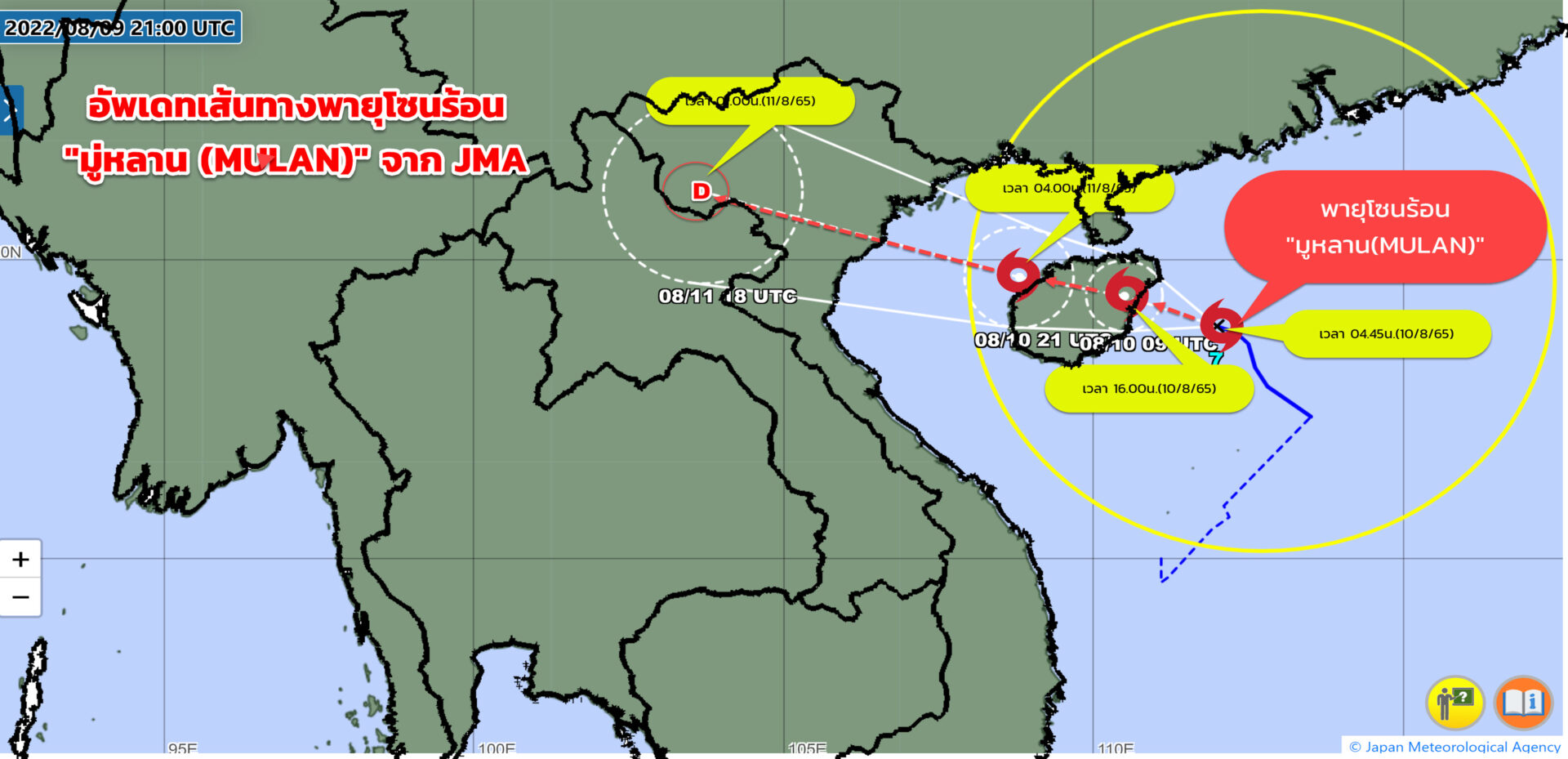 นางสาวชมภารี ชมภูรัตน์ อธิบดีกรมอุตุนิยมวิทยากล่าวว่า เมื่อเวลา 07:32 น. วันนี้ กรมอุตุนิยมวิทยาติดตามพยากรณ์ทิศทางและความเร็วลมที่ระดับสูงจากพื้นดินประมาณ 600 เมตรพบว่า พายุโซนร้อน “มู่หลาน” ที่ทวีกำลังแรงขึ้นจากพายุดีเปรสชันบริเวณทะเลจีนใต้ตอนบน ขณะนี้มีศูนย์กลางใกล้เกาะไหหลำ มีทิศทางเคลื่อนตัวทางเหนือ และมีแนวโน้มจะเปลี่ยนทิศทางไปทางตะวันตก เข้าสู่ประเทศเวียดนามตอนบนในวันที่ 11 ส.ค. 65 ส่งผลทำให้ในช่วงวันที่ 11 – 13 ส.ค. 65 มีฝนตกหนักถึงหนักมากบางแห่งบริเวณภาคเหนือ ภาคตะวันออกเฉียงเหนือ และภาคตะวันออก ทั้งนี้ฝนที่ตกสะสมอาจทำให้เกิดน้ำท่วมฉับพลันและน้ำป่าไหลหลาก โดยเฉพาะพื้นที่ลาดเชิงเขาใกล้ทางน้ำไหลผ่านและพื้นที่ลุ่ม