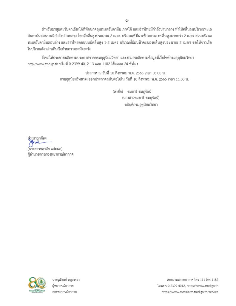 ส่วนมรสุมตะวันตกเฉียงใต้ที่พัดปกคลุมทะเลอันดามัน ภาคใต้ และอ่าวไทยมีกำลังปานกลาง ทำให้คลื่นลมบริเวณทะเลอันดามันตอนบนมีกำลังปานกลาง โดยมีคลื่นสูงประมาณ 2 เมตร บริเวณที่มีฝนฟ้าคะนองคลื่นสูงมากกว่า 2 เมตร ส่วนบริเวณทะเลอันดามันตอนล่าง และอ่าวไทยตอนบนมีคลื่นสูง 1-2 เมตร บริเวณที่มีฝนฟ้าคะนองคลื่นสูงประมาณ 2 เมตร ขอให้ชาวเรือในบริเวณดังกล่าวเดินเรือด้วยความระมัดระวัง