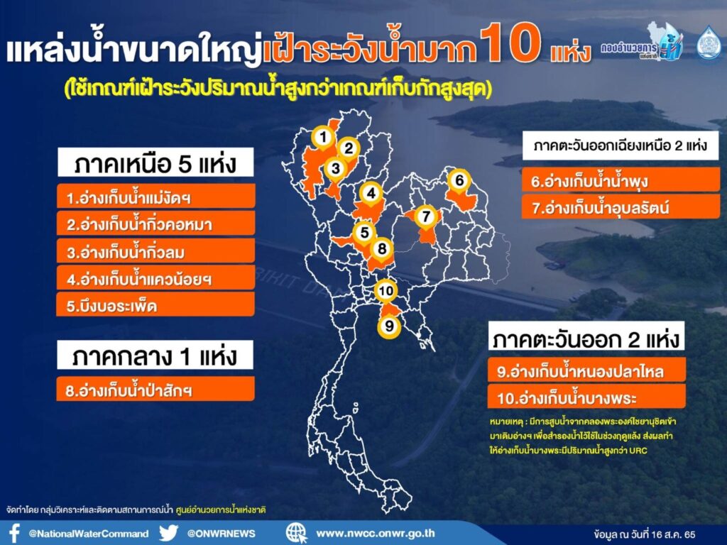 ดร.สุรสีห์ กิตติมณฑล เลขาธิการสำนักงานทรัพยากรน้ำแห่งชาติ (สทนช.) ในฐานะรองผู้อำนวยการกองอำนวยการน้ำแห่งชาติ (กอนช.) เป็นประธานการประชุมคณะประเมินสถานการณ์น้ำเพื่อติดตามสถานการณ์น้ำในช่วงฤดูฝนปี 65 โดยระบุว่า ขณะนี้มีแหล่งน้ำขนาดใหญ่ 10 แห่ง ที่ต้องเฝ้าระวังเป็นพิเศษ เนื่องจากปัจจุบันมีปริมาณน้ำสูงกว่าเกณฑ์กักเก็บน้ำสูงสุด (URC) แล้วได้แก่ อ่างเก็บน้ำแม่งัดสมบูรณ์ชล จ.เชียงใหม่ กิ่วลมและกิ่วคอหมา จ.ลำปาง แควน้อย จ.พิษณุโลก อุบลรัตน์ จ.ขอนแก่น น้ำพุง จ.สกลนคร ป่าสักชลสิทธิ์ จ.สระบุรี บางพระ จ.ชลบุรี และหนองปลาไหลจ.ระยอง รวมถึงบึงบอระเพ็ด จ.นครสวรรค์ ซึ่งเน้นย้ำให้ให้กรมชลประทานและการไฟฟ้าฝ่ายผลิตแห่งประเทศไทย (กฟผ.) บริหารจัดการน้ำโดยให้เกิดผลกระทบต่อพื้นที่ด้านท้ายน้ำให้น้อยที่สุด รวมทั้งให้บริหารจัดการน้ำร่วมกับสถานการณ์น้ำในลำน้ำและแม่น้ำด้วยเนื่องจากฝนที่ตกสะสมทำให้ดินอุ้มน้ำไว้นานอาจส่งผลให้เกิดน้ำล้นตลิ่งเข้าท่วมพื้นที่บ้านเรือนประชาชนและพื้นที่การเกษตรได้