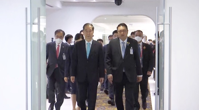 นายฮัน ด็อก-ซู นายกรัฐมนตรีเกาหลีใต้ เดินทางถึงท่าอากาศยานสุวรรณภูมิ ด้วยสายการบินโคเรียนแอร์ไลน์ เที่ยวบิน KE 657 ต้นทางจากกรุงโซล เกาหลีใต้ เพื่อร่วมประชุมความร่วมมือเขตเศรษฐกิจในภูมิภาคเอเชีย-แปซิฟิก หรือเอเปค ครั้งที่ 29 ที่ศูนย์ประชุมแห่งชาติสิริกิติ์ กรุงเทพฯ ระหว่างวันที่ 16-19 พฤศจิกายน โดยมีนายสุชาติ ชมกลิ่น รัฐมนตรีว่าการกระทรวงแรงงาน และเจ้าหน้าที่จากกระทรวงต่างประเทศ รวมทั้งนักเรียนจากวิทยาลัยนาฏศิลป์ ตำบลศาลายา อำเภอพุทธมณฑล จังหวัดนครปฐม แต่งชุดไทย ให้การต้อนรับ