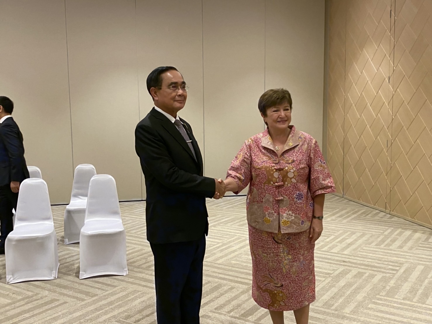 นายกรัฐมนตรีหารือทวิภาคีกับนางคริสตาลินา กอร์เกียวา (Ms. Kristalina Georgieva) กรรมการจัดการกองทุนเงินระหว่างประเทศ โดย IMF ซึ่งมีความเห็นว่า ภาพรวมเศรษฐกิจของสมาชิกเขตเศรษฐกิจเอเปคในปี 2565 ยังขยายตัวอย่างต่อเนื่อง ยอมรับว่าเศรษฐกิจโลกยังคงมีความเสี่ยงจากปัญหาเงินเฟ้อ ปัญหาโควิด-19 ที่ยังกลับมาแพร่ระบาด ความขัดแย้งรัสเซีย-ยูเครน ส่งผลกระทบต่อราคาพลังงานแพง พร้อมชื่นชมการบริหารจัดการนโยบายการคลัง บริหารจัดการหนี้สาธารณะ โดยเงินกู้ของรัฐบาลเกือบทั้งหมด ในรูปของสกุลเงินบาทที่ไม่ได้รับผลกระทบจากการสกุลดอลลาร์สหรัฐแข็งค่า