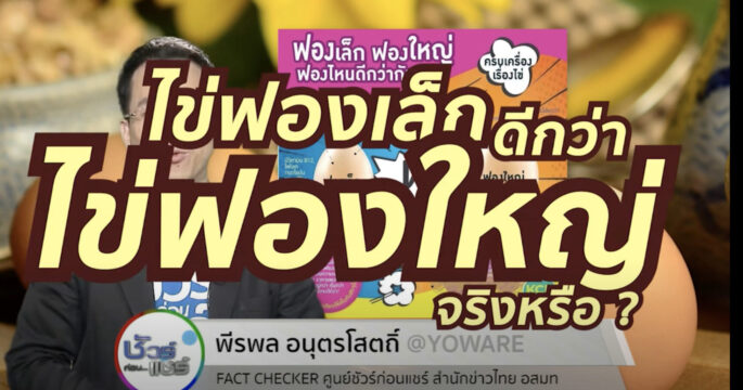 ไข่ฟองเล็กมีราคาถูกกว่าไข่ฟองใหญ่จริง ขนาดเล็กใหญ่ของไข่จะทำให้ผู้บริโภคได้รับโปรตีนแตกต่างกันเพียงเล็กน้อยเท่านั้น