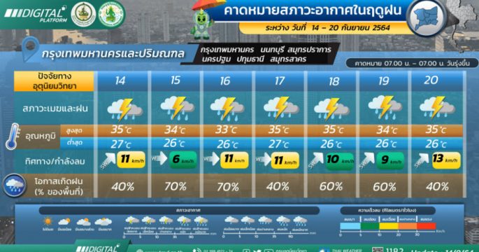 กทม. 14 ก.ย.- กทม.วันนี้ คาดมีฝนฟ้าคะนองร้อยละ 40 ขณะที่ในรอบ 24 ชั่วโมงที่ผ่านมา มีฝนเล็กน้อยบางพื้นที่ ปริมาณฝน 0.1 มม.ไม่มีรายงานจุดเร่งการระบายน้ำในถนนสายหลัก ที่สำนักการระบายน้ำรับผิดชอบ กรุงเทพมหานคร (กทม.) แจ้งรายงานสถานการณ์ประจำวันที่ 14 กันยายน 2564 ลักษณะอากาศทั่วไป : พยากรณ์อากาศ 24 ชั่วโมงข้างหน้า ร่องมรสุมพาดผ่านภาคเหนือตอนล่าง ภาคกลางตอนบน และภาคตะวันออกเฉียงเหนือ เข้าสู่หย่อมความกดอากาศต่ำบริเวณประเทศลาวตอนล่าง ประกอบกับมรสุมตะวันตกเฉียงใต้ที่พัดปกคลุมทะเลอันดามัน ภาคใต้ และอ่าวไทยมีกำลังค่อนข้างแรง ลักษณะเช่นนี้ทำให้บริเวณภาคเหนือ ภาคตะวันออกเฉียงเหนือ ภาคตะวันออก และภาคใต้มีฝนตกหนักบางแห่ง ขอให้ประชาชนที่อาศัยอยู่ในพื้นที่เสี่ยงภัยบริเวณดังกล่าว ระวังอันตรายจากฝนตกหนักและฝนที่ตกสะสมซึ่งอาจทำให้เกิดน้ำท่วมฉับพลัน และน้ำป่าไหลหลากไว้ด้วย สำหรับคลื่นลมบริเวณทะเลอันดามันและอ่าวไทยยังคงมีกำลังแรง โดยทะเลอันดามันมีคลื่นสูง 2-3 เมตร และอ่าวไทยตอนบนคลื่นสูงประมาณ 2 เมตร ส่วนบริเวณที่มีฝนฟ้าคะนองคลื่นสูงมากกว่า 3 เมตร ขอให้ชาวเรือเดินเรือด้วยความระมัดระวัง โดยหลีกเลี่ยงบริเวณที่มีฝนฟ้าคะนอง และเรือเล็กบริเวณทะเลอันดามันตอนบนควรงดออกจากฝั่งต่อไปอีก 1 วัน กรุงเทพมหานครและปริมณฑล […]