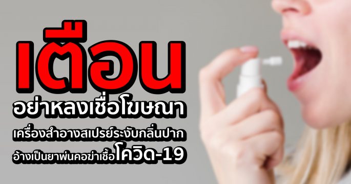 อย.เตือนอย่าหลงเชื่อโฆษณาเครื่องสำอางสเปรย์ระงับกลิ่นปาก แอบอ้างเป็นยาพ่นคอฆ่าเชื้อโควิด-19 อาจเสียโอกาสในการรักษาโรค ทำให้ป่วยมากขึ้น ผู้ป่วยโรคโควิด-19 ควรได้รับการวินิจฉัยและรักษาโรคที่ถูกต้อง