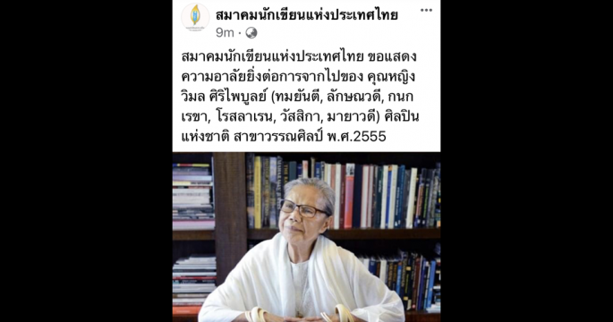 กรุงเทพฯ 13 ก.ย.- สมาคมนักเขียนแห่งประเทศไทย โพสต์แสดงความอาลัยต่อการจากไปของ คุณหญิงวิมล ศิริไพบูลย์ ศิลปินแห่งชาติ สาขาวรรณศิลป์ พุทธศักราช 2555 เพจเฟซบุ๊ก “สมาคมนักเขียนแห่งประเทศไทย” โพสต์สมาคมนักเขียนแห่งประเทศไทย ขอแสดงความอาลัยยิ่งต่อการจากไปของ คุณหญิงวิมล ศิริไพบูลย์ (ทมยันตี, ลักษณวดี, กนกเรขา, โรสลาเรน, มายาวดี) ศิลปินแห่งชาติ สาขาวรรณศิลป์ พ.ศ.2555 คำประกาศเกียรติคุณ ศิลปินแห่งชาติ กรมส่งเสริมวัฒนธรรมคุณหญิงวิมล ศิริไพบูลย์ (ทมยันตี) ศิลปินแห่งชาติ สาขาวรรณศิลป์ พุทธศักราช2555 นวนิยายเรื่องแรกคือเรื่อง ในฝัน ใช้นามปากกาว่า โรสลาเรน สร้างชื่อเสียงและได้รับความนิยมจากผู้อ่านอย่างมาก ทำให้มีโอกาสเขียนนวนิยายลงในนิตยสารอีกหลายฉบับ นามปากกา ลักษณวดี ทมยันตี และกนกเรขา แต่นามปากกาที่โดดเด่น คือ ทมยันตี ความสำเร็จและชื่อเสียงจากงานประพันธ์ทำให้ทมยันตี ยึดอาชีพนักประพันธ์เลี้ยงชีพแต่เพียงอย่างเดียวมาจนถึงปัจจุบัน ได้สร้างสรรค์นวนิยาย มีแนวเรื่องหลากหลายคือนวนิยายรัก นวนิยายสะท้อนสังคม นวนิยายอิงการเมือง นวนิยายแฟนตาซีหรือ จินตนิมิต นวนิยายเหนือจริงแนวข้ามชาติข้ามภพ […]