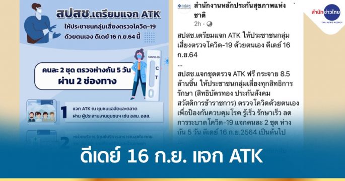 สปสช.7 ก.ย.-ดีเดย์ 16 ก.ย.นี้ สปสช.เตรียมแจก ATK ให้ประชาชนกลุ่มเสี่ยงตรวจโควิด-19 ด้วยตนเอง เพจเฟซบุ๊ก “สำนักงานหลักประกันสุขภาพแห่งชาติ” โพสต์แจ้งความคืบหน้าเรื่อง สปสช.เตรียมแจก ATK ให้ประชาชนกลุ่มเสี่ยงตรวจโควิด-19 ด้วยตนเอง ดีเดย์ 16 ก.ย.64 โดยมีรายละเอียดว่า สปสช.แจกชุดตรวจ ATK ฟรี กระจาย 8.5 ล้านชิ้น ให้ประชาชนกลุ่มเสี่ยงทุกสิทธิการรักษา (สิทธิบัตรทอง ประกันสังคม สวัสดิการข้าราชการ) ตรวจโควิดด้วยตนเอง เพื่อป้องกันควบคุมโรค รู้เร็ว รักษาเร็ว ลดการระบาดโควิด-19 แจกคนละ 2 ชุด ห่างกัน 5 วัน ดีเดย์ 16 ก.ย.2564 เป็นต้นไป การแจกชุดตรวจ ATK ให้ประชาชนกลุ่มเสี่ยง 2 รูปแบบ ดังนี้รูปแบบที่ 1 แจก ATK ณ ชุมชนแออัดและตลาดผู้ประสานงานที่ชุมชนกำหนด […]