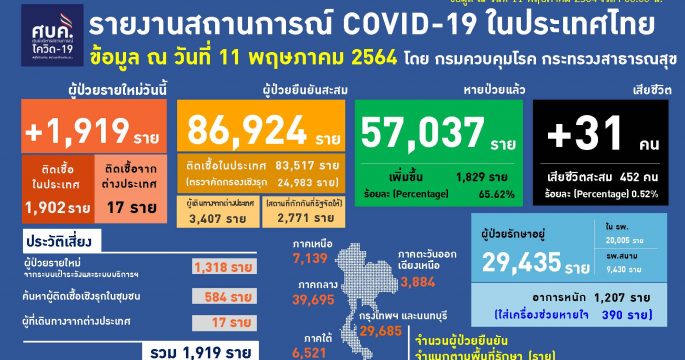 ศบค. เผยพบผู้ติดเชื้อรายใหม่ 1,919 ราย ตาย 31 กทม.พบผู้เสียชีวิตมากสุด 86% มีโรคประจำตัว ขณะที่ 17 จังหวัดที่ไม่มีรายงานการพบผู้ป่วยรายใหม่