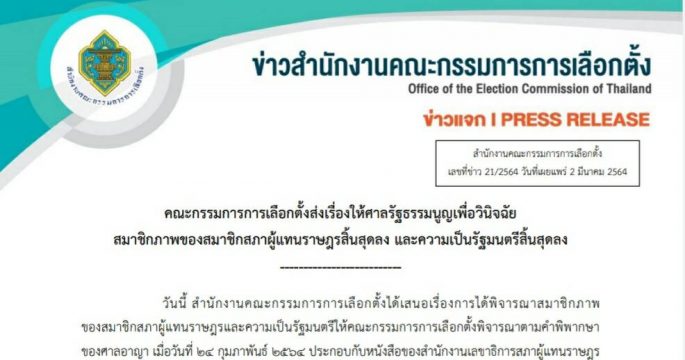 กกต. มีมติส่งเรื่องให้ศาลรัฐธรรมนูญวินิจฉัยสมาชิกภาพ 5 ส.ส. และ 3 รัฐมนตรีสิ้นสุดลง หลังศาลอาญาพิพากษาคดี กปปส.