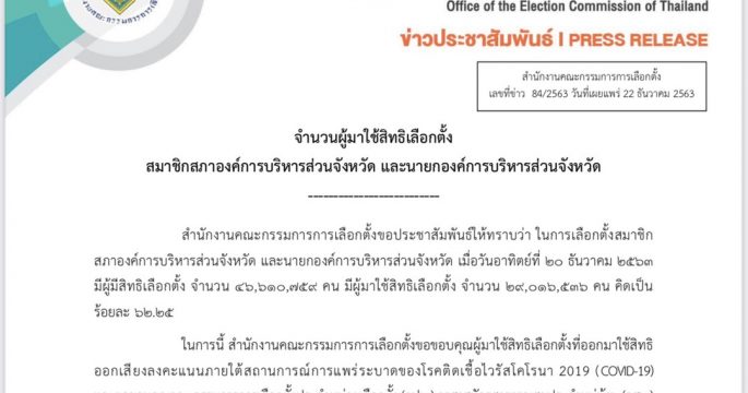 กกต.เผยยอดผู้ใช้สิทธิเลือกตั้งสมาชิกและนายก อบจ. ร้อยละ 62.25 ขอบคุณผู้มีสิทธิที่ฝ่าโควิด-19 ออกมาเลือกตั้ง