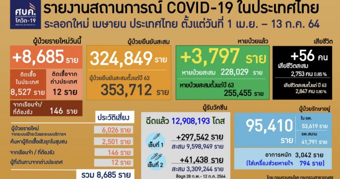 ศบค.รายงานพบผู้ติดเชื้อรายใหม่อีก 8,685 ราย เสียชีวิต 56 ราย ผู้ป่วยอาการหนัก 3,042 ราย ขณะที่ กทม.ยังพบป่วยรายวันสูงสุด 2,631 ราย ยอดสะสมพุ่ง101,575 ราย