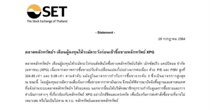 ตลาดหลักทรัพย์ฯ เตือนผู้ลงทุนให้ระมัดระวังก่อนเข้าซื้อขายหลักทรัพย์ XPG