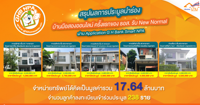 ธนาคารอาคารสงเคราะห์ เผยผลการนำร่องเปิดประมูลบ้านมือสองออนไลน์ครั้งแรกผ่าน Application : G H Bank Smart NPA ประชาชนให้ความสนใจลงทะเบียนเข้าร่วมประมูลทั้งสิ้นจำนวน 238 ราย สามารถจำหน่ายทรัพย์ได้คิดเป็นมูลค่ารวม 17.64 ล้านบาท