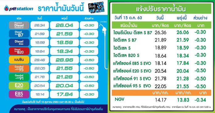 ปตท.- บางจาก ปรับลดราคาขายปลีกน้ำมันกลุ่มเบนซินและแก๊สโซฮอลล์ทุกชนิดลง 0.50 บาทต่อลิตร เว้น E85 ปรับลดลง 0.30 บาทต่อลิตร ส่วนกลุ่มดีเซลทุกชนิดปรับลดลง 0.30 บาทต่อลิตร มีผล 16 ต.ค. 63
