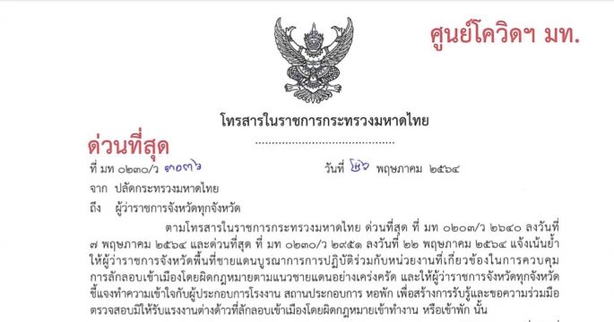 ศบค.มท. เน้นย้ำผู้ว่าฯ เพิ่มจุดตรวจ ความถี่ลาดตระเวนชายแดน บูรณาการกำลังทหาร ตำรวจ ฝ่ายปกครองเฝ้าระวังลักลอบเข้าเมืองผิดกฎหมาย พร้อมลงโทษทั้งผู้นำพา-ผู้สนับสนุน