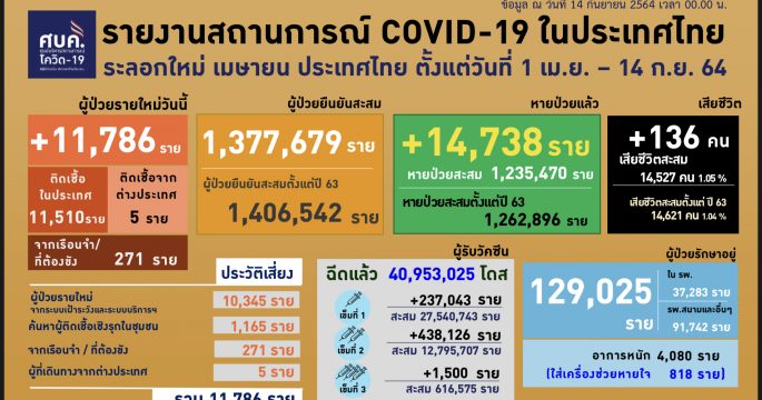 ศบค.รายงานพบผู้ติดเชื้อ 11,786 ราย ตาย 136 ราย อาการหนัก 4 พันราย ใส่เครื่องช่วยหายใจ 818 ราย ขณะกรุงเทพฯ-ปริมณฑล ยอดยังสูง