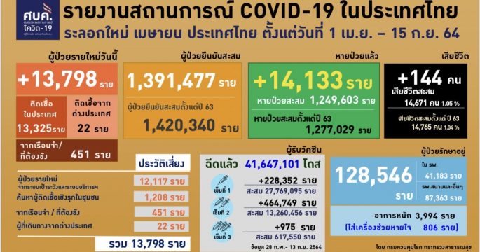 . เผยไทยพบผู้ป่วยโควิด-19 รายใหม่ 13,798 ราย อาการหนัก 3,994 ราย ผู้เสียชีวิต 144 ราย ขณะที่กทม.จำนวนติดเชื้อลดลง แต่มีรายงานคลัสเตอร์ใหม่เป็นแคมป์คนงานเพิ่ม