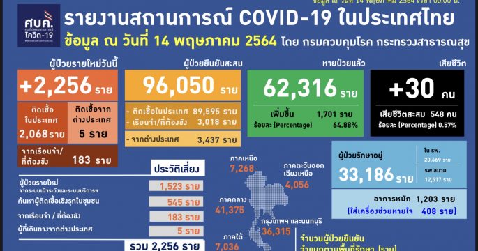 ศบค. เผยพบผู้ติดเชื้อรายใหม่ 2,256 ราย เสียชีวิตเพิ่ม 30 ราย อายุน้อยสุด 15 ปี พิการทางสมอง ติดเตียง ระบุ ระยะครองเตียงนานขึ้น มากถึงเดือนกว่า