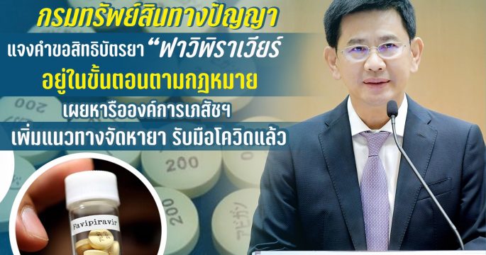 กรมทรัพย์สินทางปัญญา แจงคำขอสิทธิบัตร “ยาฟาวิพิราเวียร์” อยู่ในขั้นตอนตามกฎหมาย เผยหารือองค์การเภสัชฯ เพิ่มแนวทางจัดหายารับมือโควิดแล้ว