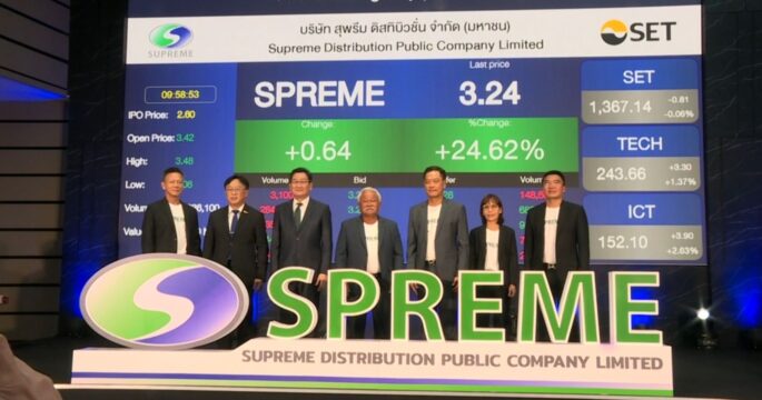 กรุงเทพฯ 2 พ.ค. – บมจ. สุพรีม ดิสทิบิวชั่น (SPREME) เปิดเทรดวันแรกที่ราคา 3.42 บาท เพิ่มขึ้น 0.82 บาท หรือเพิ่มขึ้น 31.54% จากราคา IPO ที่ 2.60 บาท