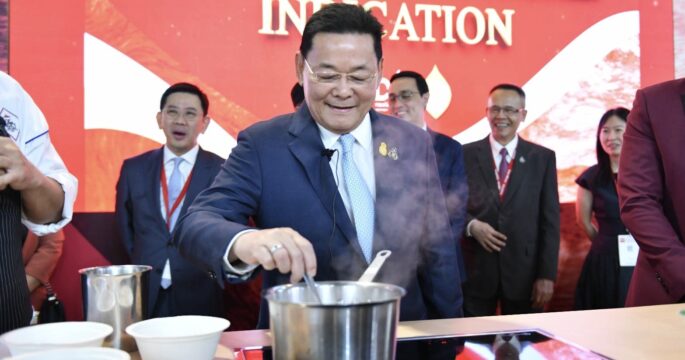 นนทบุรี 28 พ.ค.-นภินทร รมช.พณ. เยี่ยมชมบูธ GI ในงาน Thaifex Anuga Asia 2024 ขนทัพสินค้า GI ร่วม 24 รายการ แสดงศักยภาพสินค้าเกษตรไทย พร้อมรังสรรค์เมนูสุดพิเศษร่วมกับ เชฟจารึก เชฟชื่อดังจากรายการ เชฟกระทะเหล็กประเทศไทย โดยใช้วัตถุดิบจากสินค้า GI คือ มะพร้าวน้ำหอมราชบุรี  เป็นเมนูต้มข่าไก่มะพร้าวน้ำหอมราชบุรี สร้างมูลค่า ยกระดับอาหารไทยด้วยวัตถุดิบ สินค้า GI