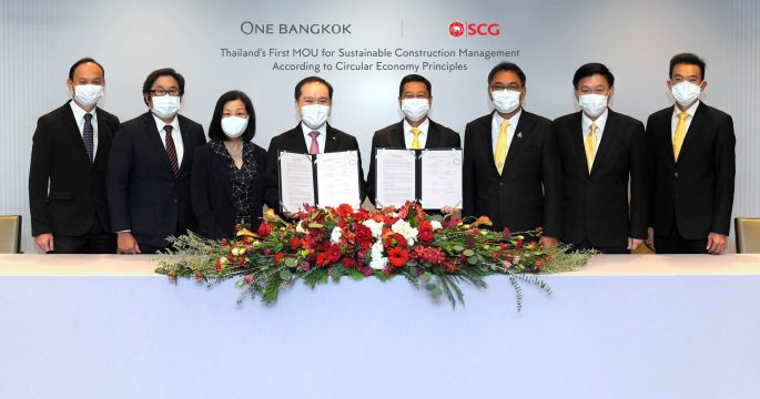 กรุงเทพฯ14 ก.ค.-วัน แบงค็อก จับมือ เอสซีจี ร่วมลงนามบันทึกข้อตกลงในด้านการบริหารการก่อสร้างแบบยั่งยืนตามหลักเศรษฐกิจหมุนเวียน “วัน แบงค็อก” (One Bangkok) โครงการอสังหาริมทรัพย์ที่ครบวงจรและใหญ่ที่สุดในประเทศไทยด้วยมูลค่าการลงทุนกว่า 1.2 แสนล้านบาท จับมือ เอสซีจี ร่วมลงนามบันทึกข้อตกลงความร่วมมือในการบริหารการก่อสร้างโครงการแบบยั่งยืนตามหลักเศรษฐกิจหมุนเวียน CIRCULAR ECONOMY 2 ฉบับ ประกอบด้วย การนำเศษคอนกรีตจากการตัดเสาหัวเข็มที่เหลือใช้มารีไซเคิลเพื่อผลิตผนังหล่อสำเร็จรูปและนำมาใช้ในโครงการและการพัฒนาแผนการจัดการขยะและมลพิษจากการก่อสร้างโครงการแบบองค์รวม