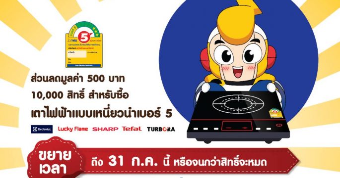 กรุงเทพฯ 2 ก.ค.-กฟผ. ขยายระยะเวลามอบสิทธิ์ส่วนลด 500 บาท สำหรับซื้อเตาไฟฟ้าแบบเหนี่ยวนำเบอร์ 5 จนถึงวันที่ 31 กรกฎาคม 2564 เพื่อส่งเสริมการใช้งานเตาไฟฟ้าแบบเหนี่ยวนำเบอร์ 5 นำไปสู่การใช้ไฟฟ้าอย่างมีประสิทธิภาพ และสร้างอากาศที่ดีให้กับคนไทย รวมถึงมีส่วนช่วยกระตุ้นเศรษฐกิจของประเทศ