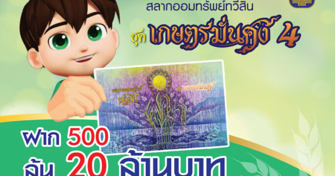 วันพรุ่งนี้แล้วที่ธ.ก.ส. จะเปิดให้ลูกค้าใหม่และลูกค้าทั่วไปฝาก “สลากออมทรัพย์ ธ.ก.ส. ชุดเกษตรมั่นคง 4” ฝาก 500 บาท ลุ้นรางวัลใหญ่ 20 ล้านบาท หลังจากเปิดจองและฝากสลากสำหรับเกษตรกรลูกค้าและผู้ฝากสลากออมทรัพย์ทวีสิน 3 ที่ครบกำหนดไถ่ถอนไปแล้ว