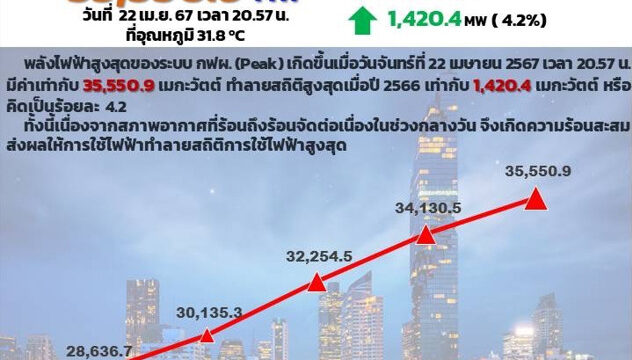 กรุงเทพฯ 23 เม.ย.-อากาศที่ร้อนจัดเมื่อคืนนี้ คนไทยดับร้อนด้วยการเปิดแอร์กันมากขึ้นทำให้ การใช้ไฟฟ้าของไทยขึ้นสู่ระดับสูงสุดหรือพีกครั้งใหม่ เมื่อช่วงใกล้ 3 ทุ่ม 35,550.9 เมกะวัตต์ การไฟฟ้าฝ่ายผลิตแห่งประเทศไทยไทย แจ้งว่า จากอากาศร้อนจัดในปีนี้ ทำให้การใช้ไฟฟ้าพุ่งขึ้นทำลายสถิติสูงสุด (พีก) อย่างต่อเนื่อง โดยล่าสุดได้เกิดพีกของประเทศครั้งใหม่ เมื่อวันที่ 22 เม.ย.67 เวลา 20.57 น. ที่ 35,550.9 เมกะวัตต์ สูงกว่าปีที่แล้ว 1,420.4 เมกะวัตต์ หรือ ร้อยละ 4.2 เนื่องจาก สภาอากสที่ร้อนถึงร้อนจัด ในช่วงกลางวัน จึงเกิดความร้อนสะสม ส่งผลให้เกิดพีกดังกล่าว ผู้สื่อข่าวรายงานว่า ในช่วง 8 เดือนแรกของปีนี้ แม้ค่าไฟต่อหน่วยจะไม่ขยับขึ้น แต่บ้านเราเป็นอัตราค่าไฟแบบขั้นบันได คือ ยิ่งใช้มาก ค่าไฟต่อหน่วยอันดับท้ายๆ ก็จะสูงขึ้น จะมีผลทำให้ประชาชนจ่ายค่าไฟเพิ่มขึ้นด้วย ในเดือนที่ร้อนจัด โดยในปีนี้เกิดพีกไฟฟ้าขึ้นแล้ว 5 ครั้ง โดยกระทรวงพลังงานมีการจัดการให้มีไฟฟ้าและเชื้อเพลิงอย่างเพียงพอไม่ขาดแคลน แต่เนื่องจากไทยมีการเข้าก๊าซธรรมชาติเหลว (แอลเอ็นจี) […]