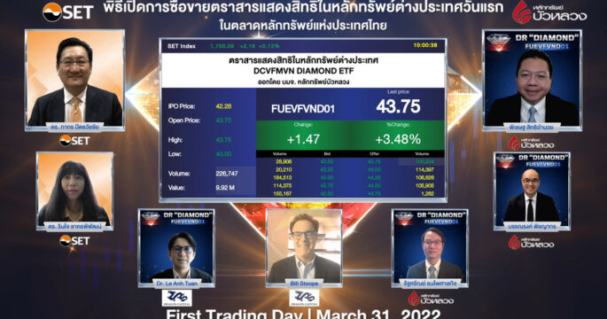DR “DIAMOND ETF” เปิดเทรด 43.75 บาท เหนือจอง 3.48% ลงทุนในดัชนี VN DIAMOND ของเวียดนาม เป็นทางเลือกช่วยผู้ลงทุนไทยกระจายการลงทุนไปต่างประเทศผ่านตลาดหลักทรัพย์ไทย