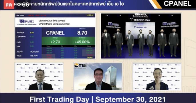 บมจ. ซีแพนเนล ผู้ผลิตและจำหน่ายแผ่นพื้นและผนังคอนกรีตสำเร็จรูป และส่วนประกอบอาคารที่ผลิตจากคอนกรีตสำเร็จรูป เปิดเข้าซื้อขายในตลาดหลักทรัพย์ เอ็ม เอ ไอ เช้านี้ ด้วยมูลค่าหลักทรัพย์ ณ ราคา IPO 900 ล้านบาท โดยใช้ชื่อย่อในการซื้อขายหลักทรัพย์ว่า “CPANEL” นักลงทุนสนใจเปิดซื้อขายบวกทันที 8.70 บาทต่อหุ้น