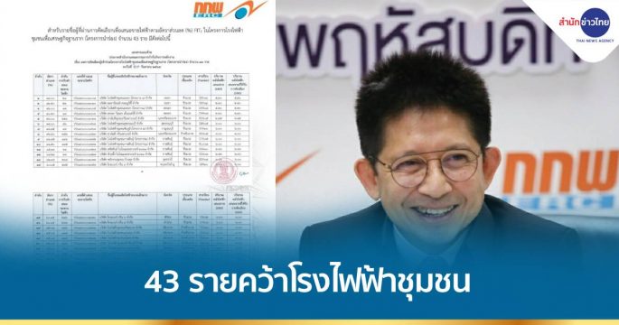 กกพ.ประกาศรายชื่อผู้ได้รับการคัดเลือกโครงการโรงไฟฟ้าชุมชนฯ 43รายกำลังผลิต 149.50 เมกะวัตต์ จากผู้ผ่านเทคนิค 169 ราย แข่งเดือดราคาต่ำ