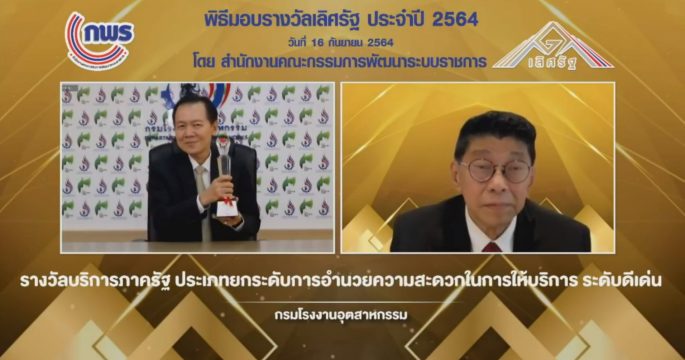 กรมโรงงานอุตสาหกรรม (กรอ.) คว้ารางวัลเลิศรัฐ ประเภทยกระดับการอำนวยความสะดวกในการให้บริการ ระดับดีเด่น ประจำปี พ.ศ. 2564 จากการเพิ่มขีดความสามารถตามนโยบายปฏิรูปอุตสาหกรรมสู่ 4.0 พร้อมเดินหน้านำเทคโนโลยีสารสนเทศเข้ามาเป็นเครื่องมือสำคัญเพื่อสนับสนุนการบริการและอำนวยความสะดวกแก่ผู้ประกอบการให้เกิดประโยชน์สูงสุด