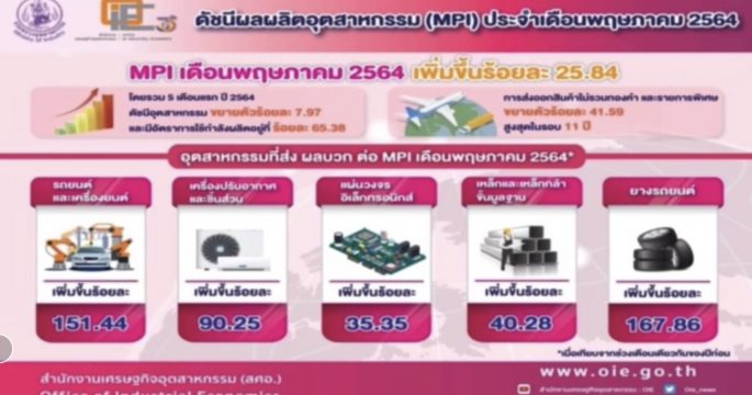 กระทรวงอุตสาหกรรมแถลงดัชนี MPI ประจำเดือน พ.ค. 64 ยังเติบโตต่อเนื่องตามกระแสความต้องการตลาดโลกแม้อยู่ในภาวะแพร่ระบาดโควิด-19